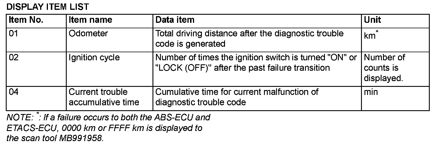 When detecting fault and storing the DTC, the ECU connected to CAN bus line obtains the data before the determination of the DTC and the data when the DTC is determined, and then stores the ECU status of that time. By analyzing each data from scan tool, the troubleshooting can be performed more efficiently. The displayed items are as the table below.
