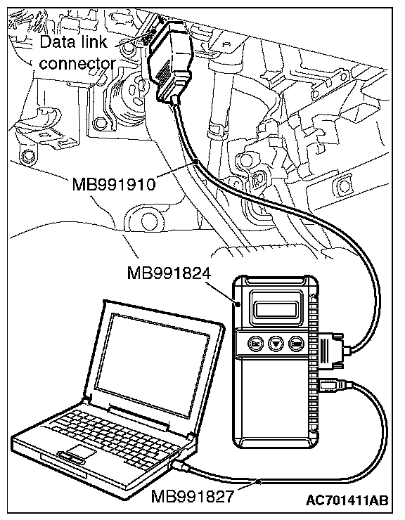CAUTION: To prevent damage to scan tool MB991958, always turn the ignition switch to the "LOCK" (OFF) position before connecting or disconnecting scan tool MB991958.