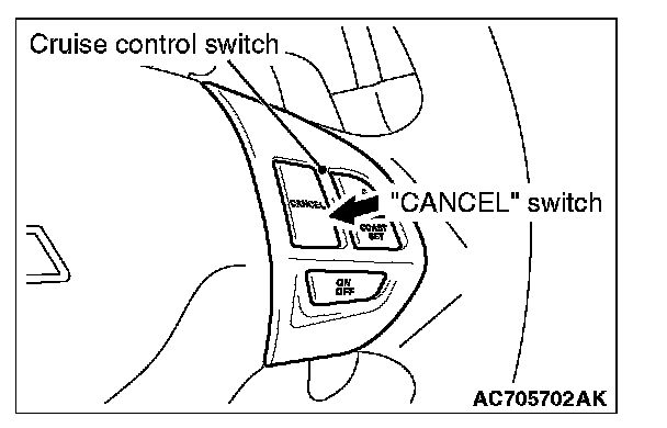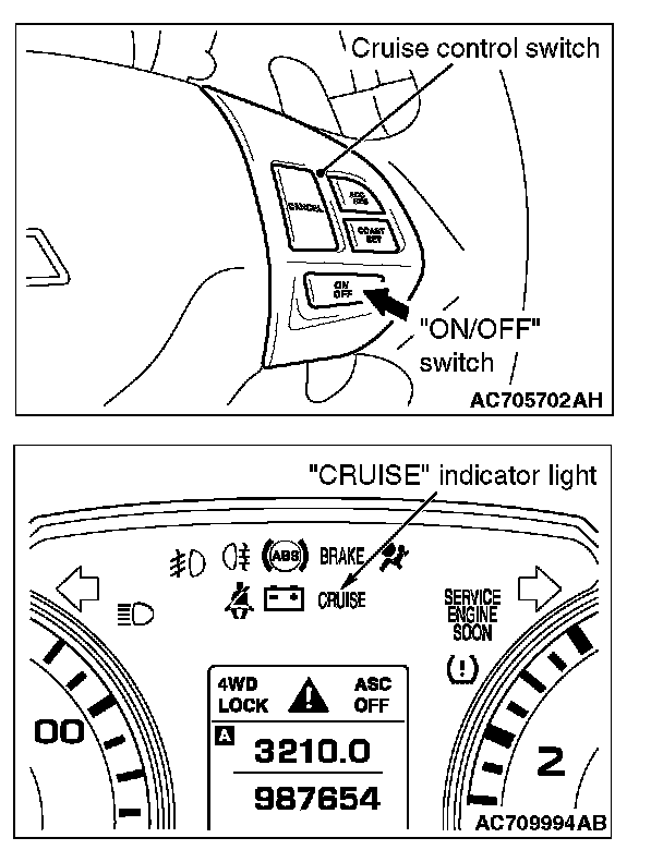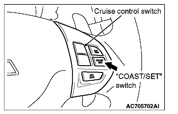 1. Press the "ON/OFF" switch (cruise control system: ON, "CRUISE" indicator light: illuminated).