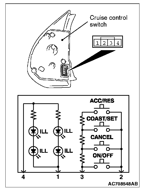 3. Check for continuity between terminal 1 and terminal 4 of the cruise control switch.