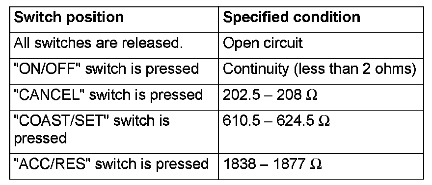 2. Measure the resistance between terminal 2 and terminal 3 when each of the "COAST/SET", "ACC/RES", "CANCEL" and "ON/OFF" switches is pressed. If values measured at the time each switch is pressed correspond to those in the table below, the resistance values are correct.