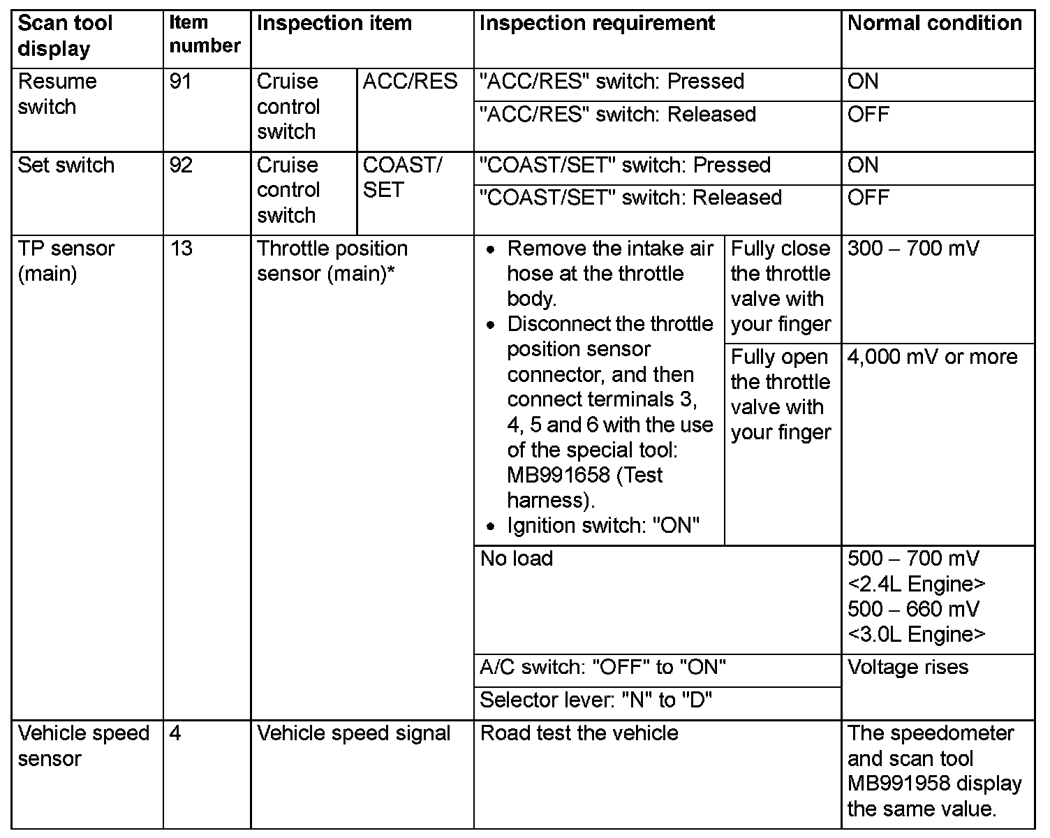 NOTE: *:After the inspection is completed, Reconnect the throttle position sensor connector, and then delete the diagnostic trouble code using scan tool MB991958 (Refer to Diagnostic Function - How to Read and Erase Diagnostic Trouble Codes) [2.4L Engine] With Manufacturer's Scan Tool or (Refer to Diagnostic Function - How to Read and Erase Diagnostic Trouble Codes [3.0L Engine]. Reading and Clearing Diagnostic Trouble Codes
