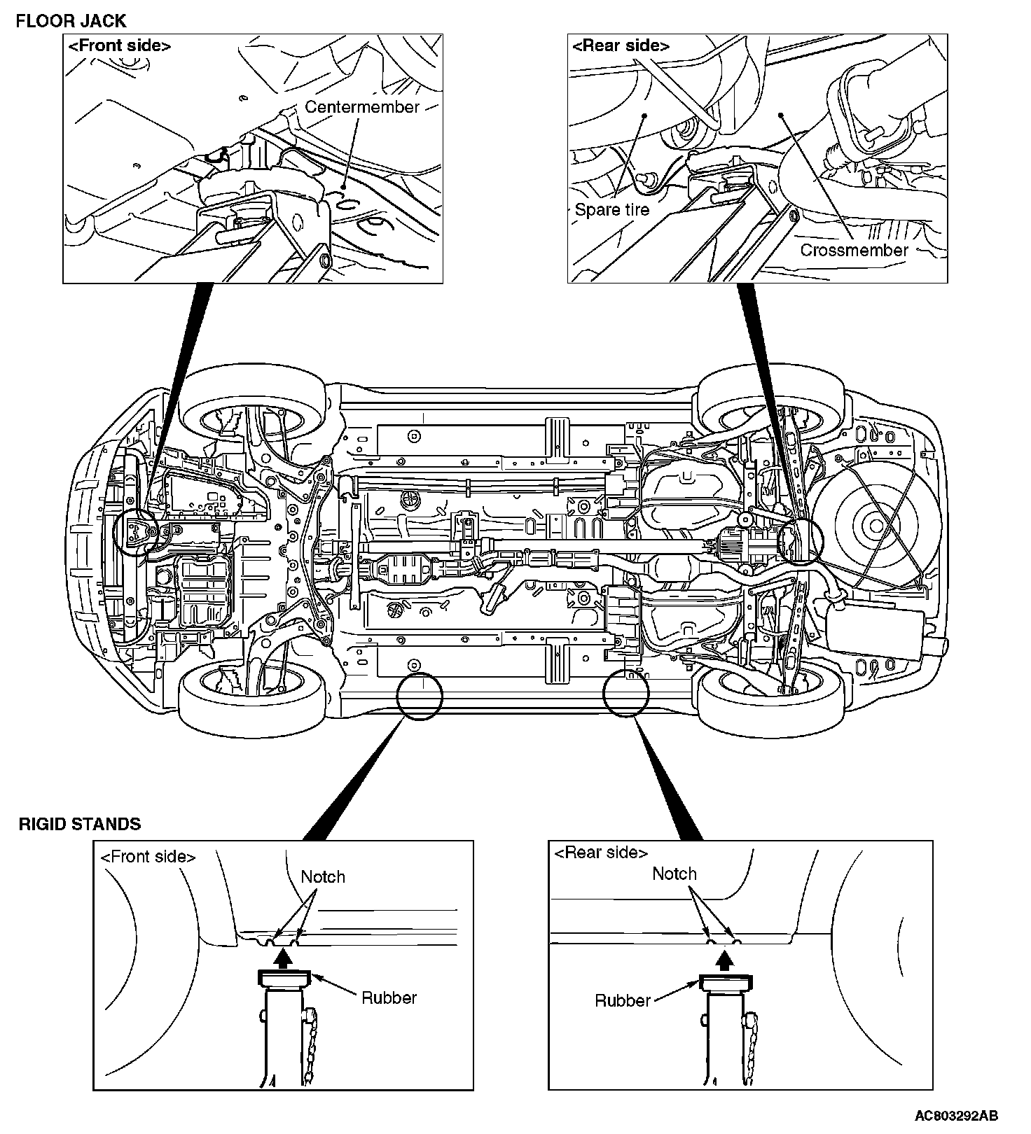 ^ For lifting, put rubber or similar material between the side sill and rigid rack, or the side sill area will be damaged.