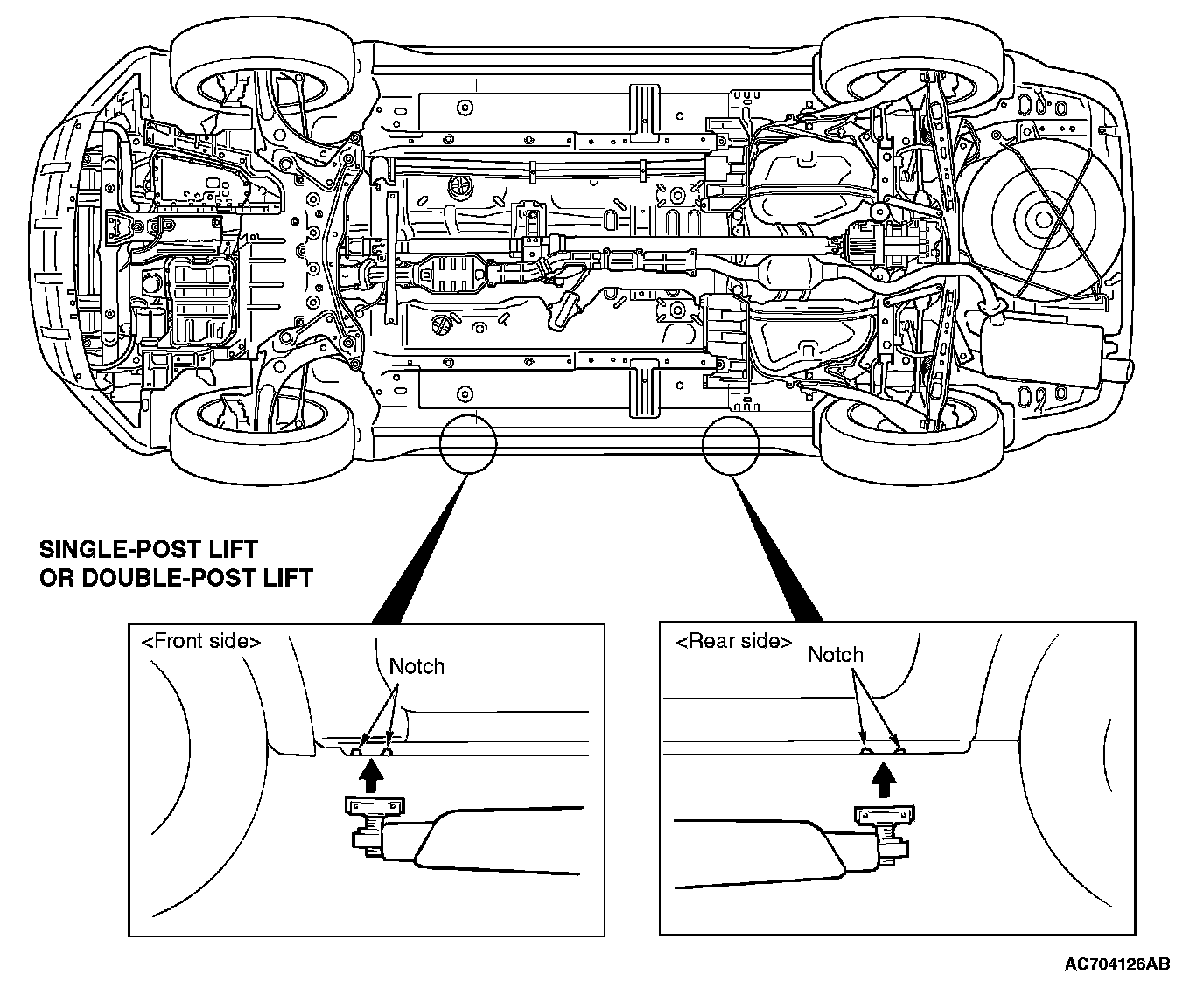 Special care should be taken when raising the vehicle on a frame contact type hoist. The hoist must be equipped with the proper adapters in order to support the vehicle at the proper locations.