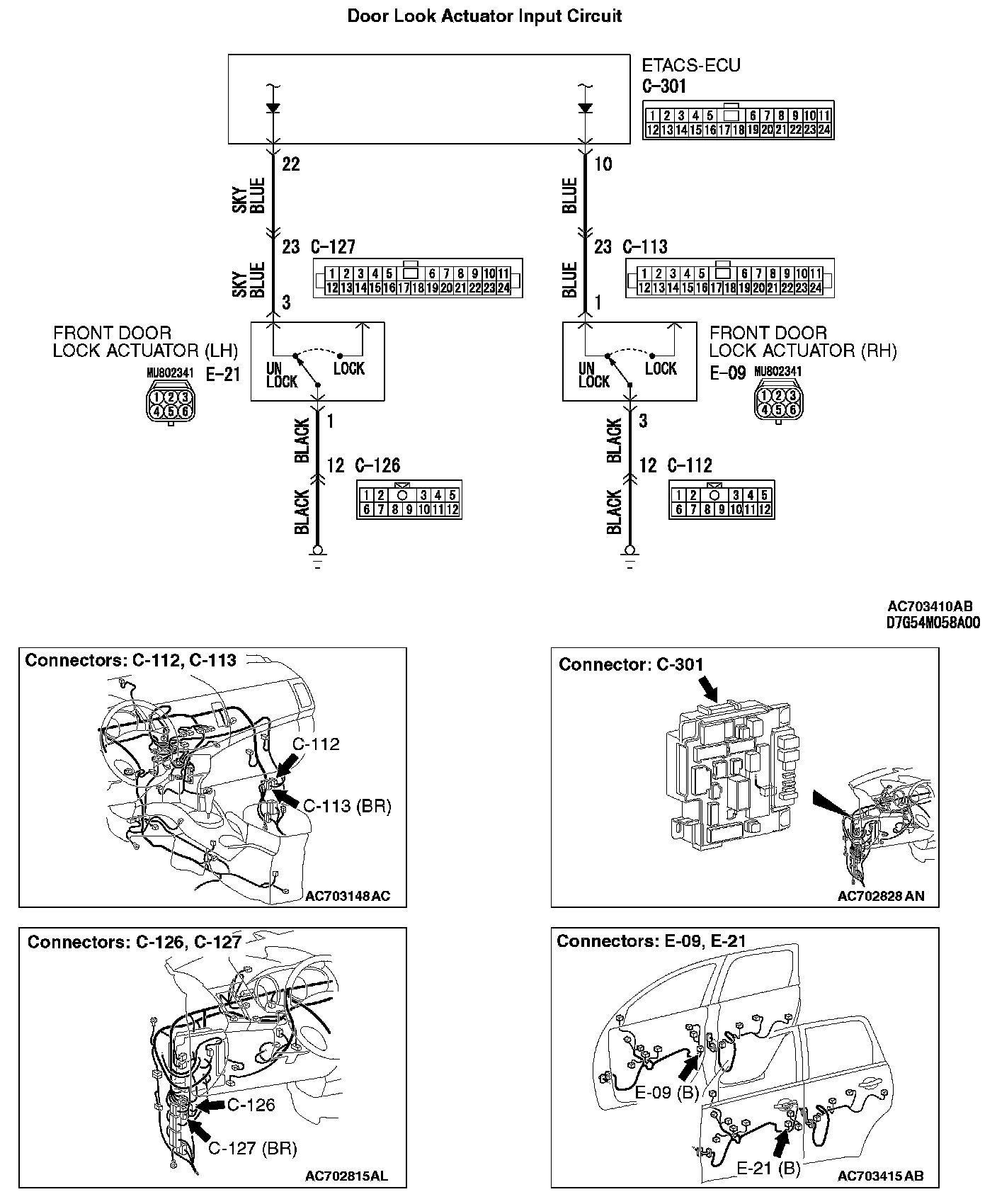 STEP 7. Check the wiring harness between front door lock actuator (LH) connector E-21 (terminal 3) and ETACS-ECU connector C-301 (terminal 22).