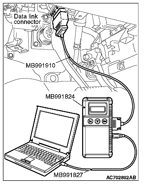 CAUTION: To prevent damage to scan tool MB991958, always turn the ignition switch to the "LOCK" (OFF) position before connecting or disconnecting scan tool MB991958.
