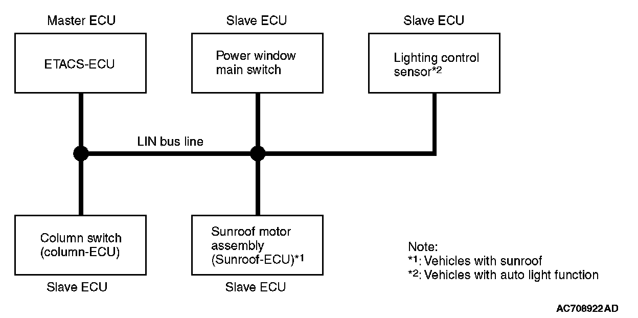 Master and slave ECUs are connected to the LIN bus lines. The master ECU is the ETACS*1-ECU, and the slave ECUs are the column switch (column- ECU), the power window main switch, the sunroof- ECU*2 and the lighting control sensor*3. The master ECU requests these slave ECUs to communicate each other via communication lines.