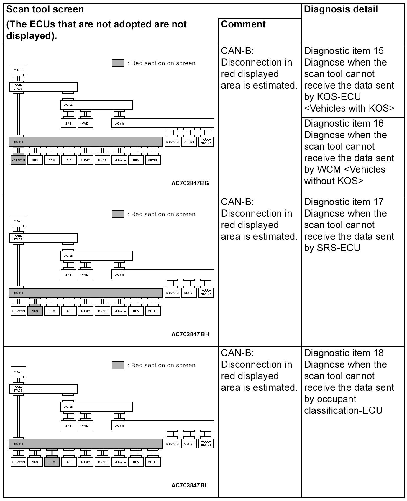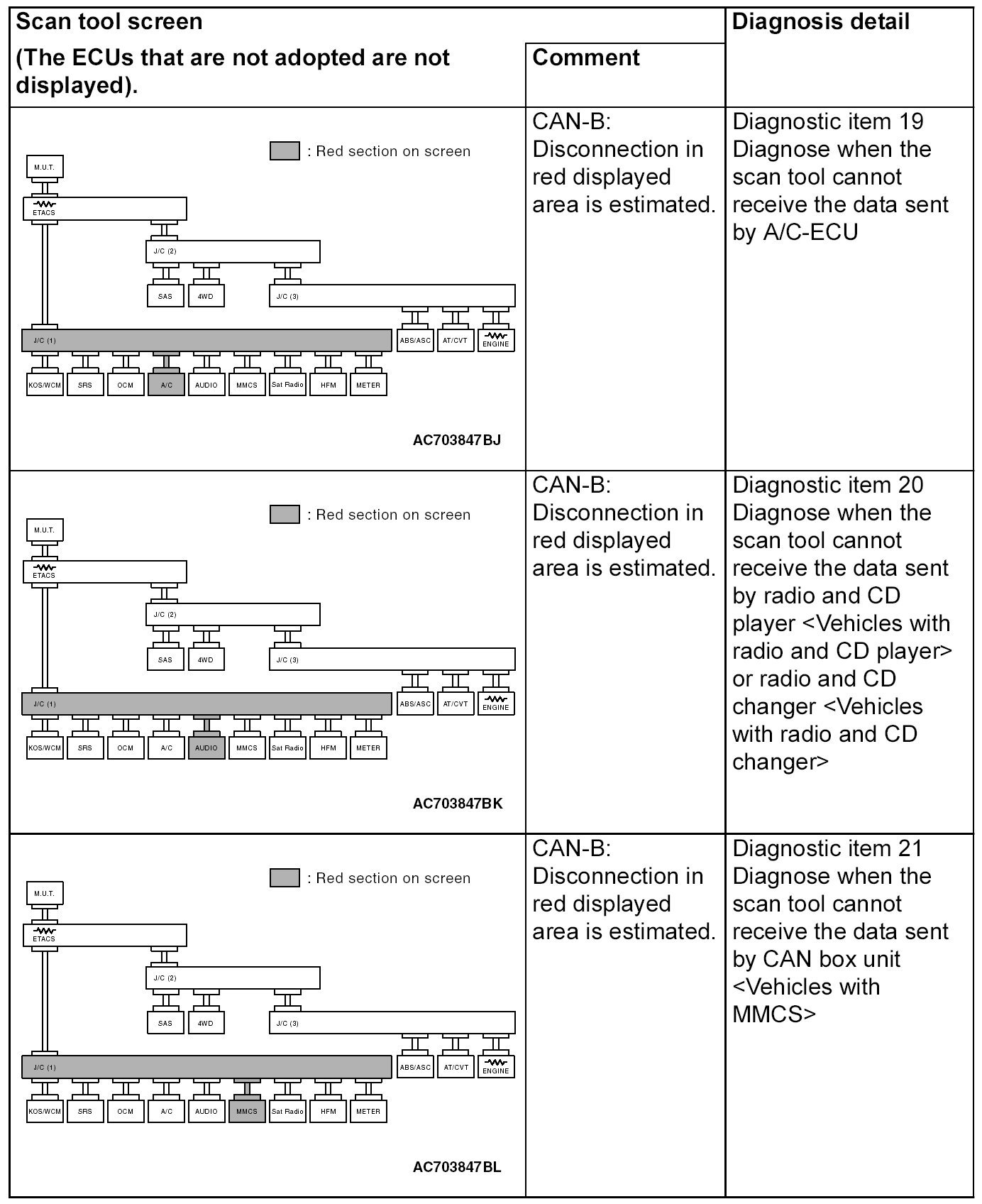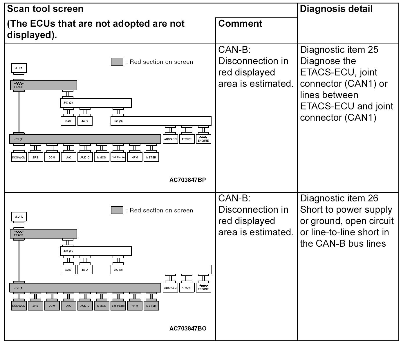 - A diagnostic trouble code may not also be set in the CAN-B lines under the conditions below. If no diagnostic trouble code has been set due to electrical noise, confirm diagnostic item 26. Diagnostic Item 26