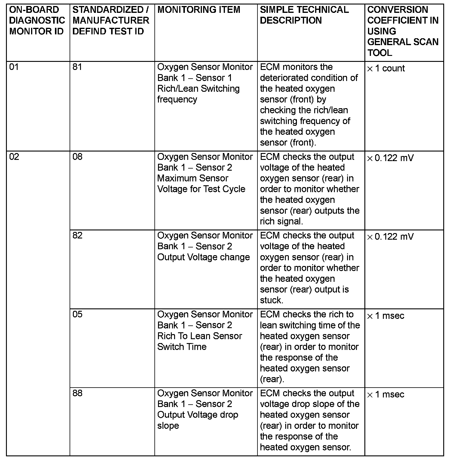 By selecting MODE 6 using scan tool, Test Result and Limit Value (minimum) *1 or (maximum) *2 about the main items of emission control system which ECM monitors can be confirmed. The value at the last monitoring is output by ECM as a test result.