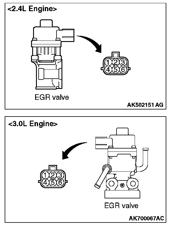 2. Measure the resistance between terminal No. 2 and either terminal No. 1 or terminal No. 3 of the connector at the EGR valve.