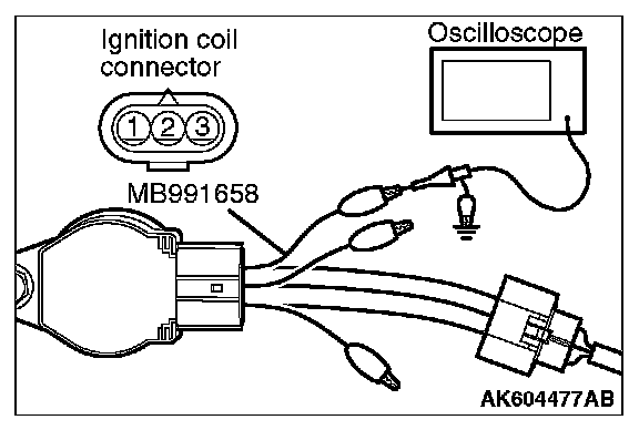 1. Disconnect the ignition coil connector, and connect test harness special tool (MB991658) between the separated connector. (All terminals should be connected.)