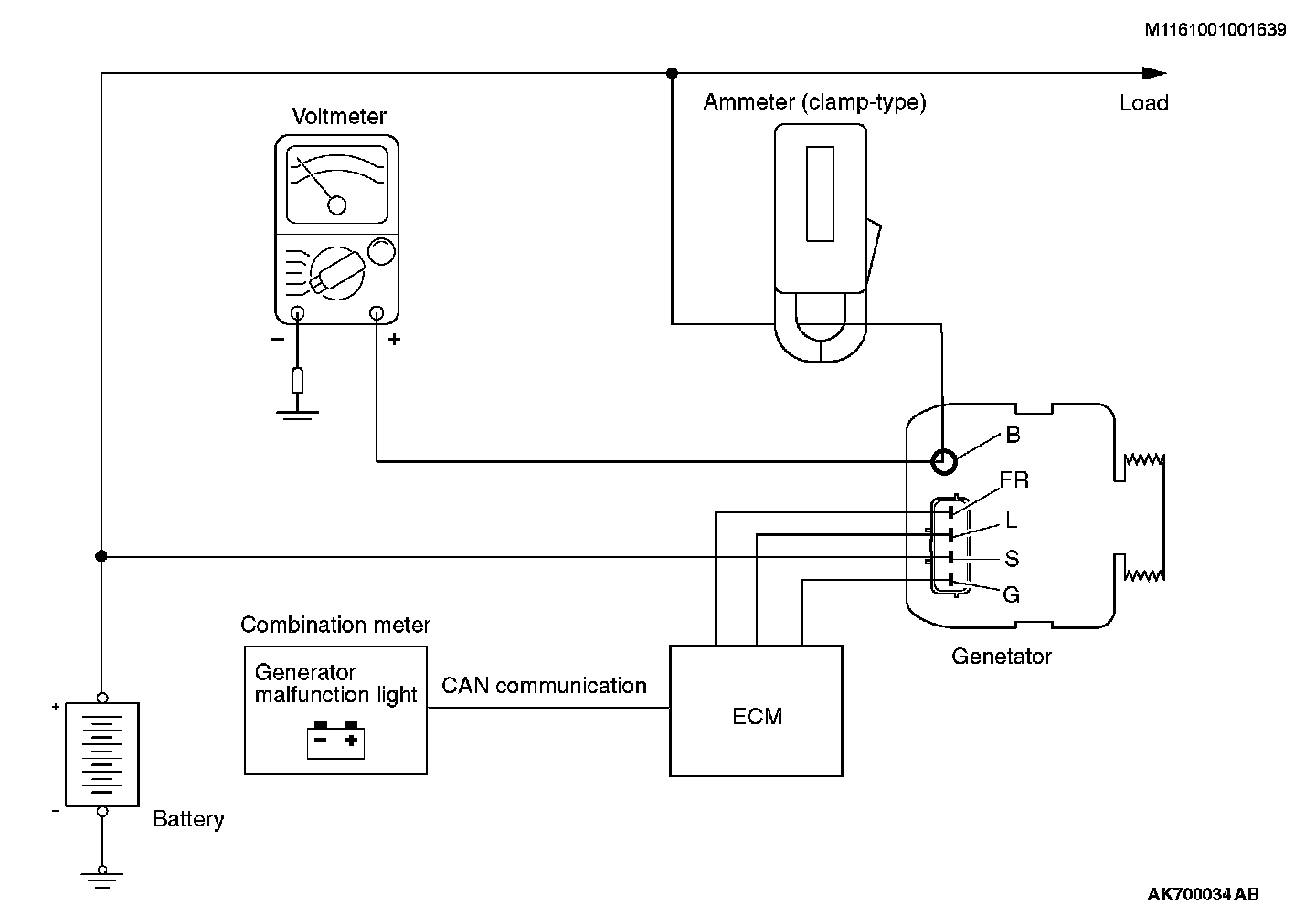 NOTE: Disconnecting the generator output wire and connecting the ammeter may not thoroughly diagnose an output current drop problem because of an insufficient connection between terminal "B" and the output wire.