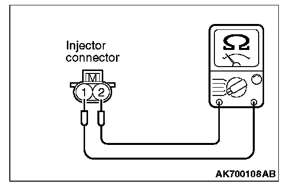 2. Measure the resistance between injector side connector terminals 1 and 2.