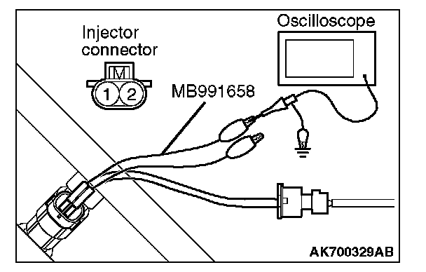 1. Disconnect the injector connector, and connect the test harness special tool (MB991658) between the separated connector. (All terminals should be connected.)