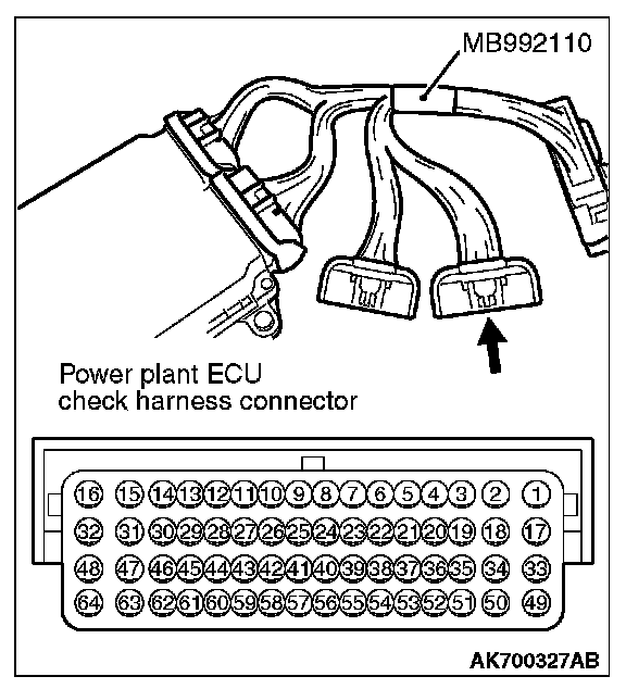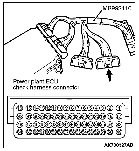 1. Disconnect all ECM connectors. Connect the check harness special tool (MB992110 between the separated connectors.