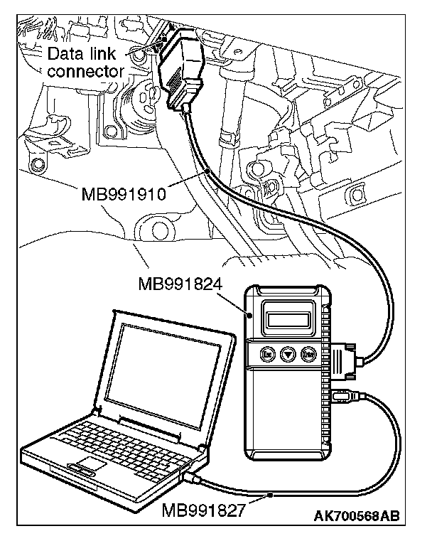 CAUTION: To prevent damage to scan tool MB991958, always turn the ignition switch to the "LOCK" (OFF) position before connecting or disconnecting scan tool MB991958.