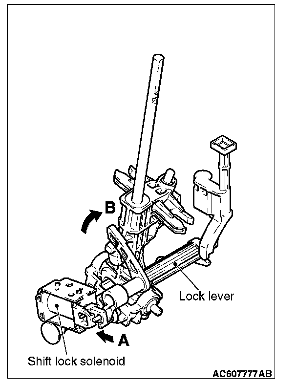 Check that the lock lever smoothly moves in the direction of arrow B in the figure when the shift lock solenoid plunger is pressed in the direction of arrow A, and smoothly moves back to the original position when the plunger is released.