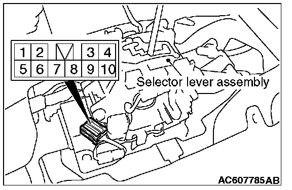 2. Using a jumper wire, connect the battery (+) to the selector lever assembly connector terminals No. 3 and No. 4, and the battery (-) to the terminal No. 6. Then, check the operation of shift lock solenoid.