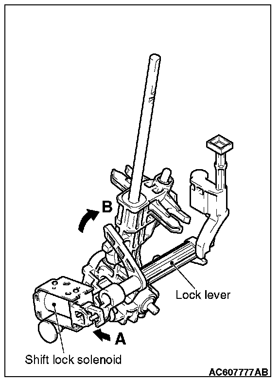 Check that the lock lever smoothly moves in the direction of arrow B in the figure when the shift lock solenoid plunger is pressed in the direction of arrow A, and smoothly moves back to the original position when the plunger is released.