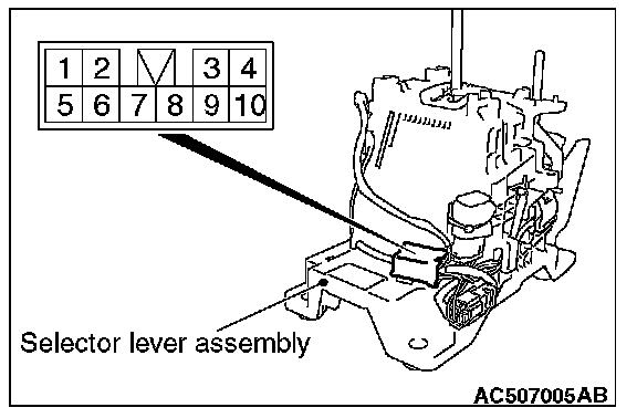 2. Using a jumper wire, connect the battery (+) to the selector lever assembly connector terminals No. 3 and No. 4, and the battery (-) to the terminal No. 6. Then, check the operation of shift lock solenoid.
