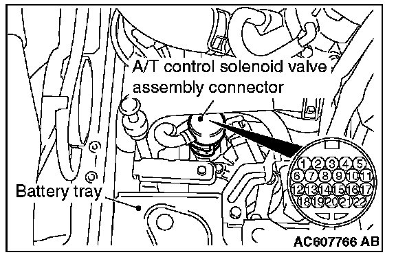 TRANSMISSION FLUID TEMPERATURE SENSOR CHECK1. Disconnect the A/T control solenoid valve assembly connector.