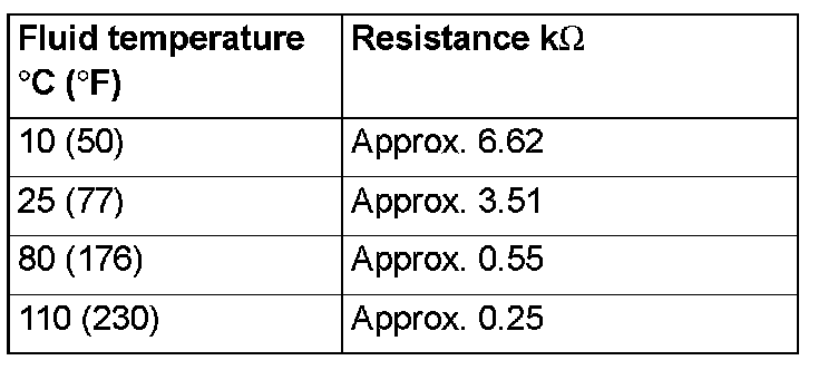 3. When the resistance of the transmission fluid temperature sensor is outside the standard value, and the transmission fluid temperature warning comes on/goes out at other than the specified temperatures, replace the valve body assembly and the harness.