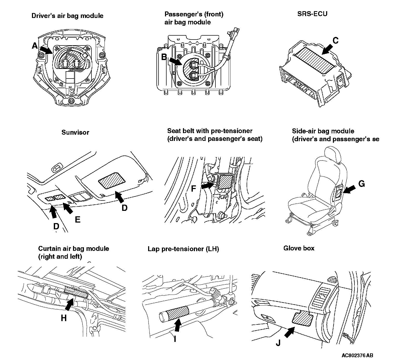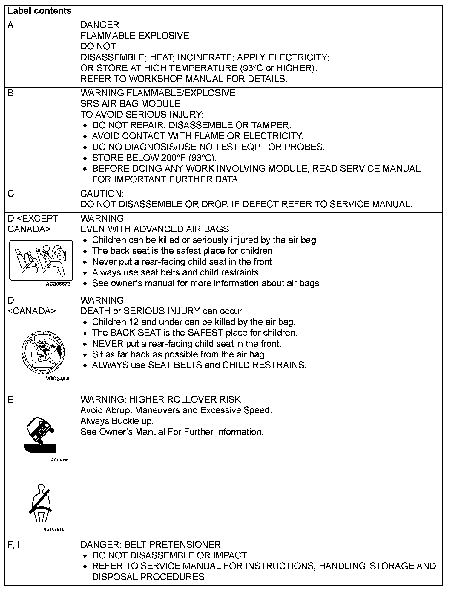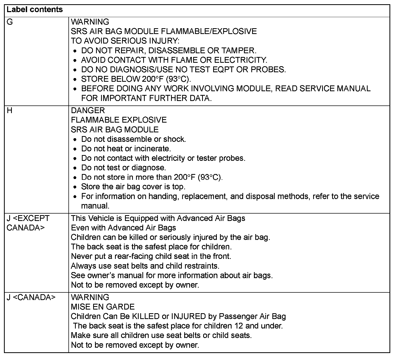 WARNING/CAUTION LABELSA number of caution labels related to the SRS are found in the vehicle, as shown in the following illustrations. Follow label instructions when servicing SRS. The label I is not to be removed except by owner. If the other labels are dirty or damaged, replace them.