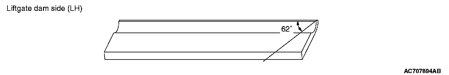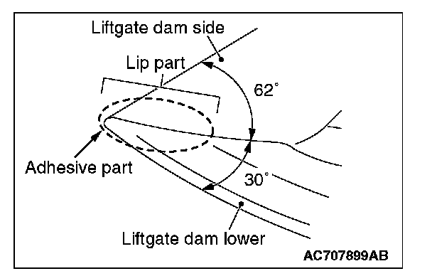2. Attach together the lip of liftgate dam lower 30° -end with the lip of liftgate dam side 62° -end (ensure that there is no level difference at the lip adhesion area).