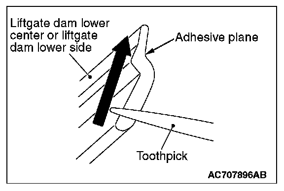 NOTE: When applying the adhesive to the adhesion surfaces of the liftgate dam lower center and the liftgate dam lower side (LH, RH), the task becomes easier if a tooth pick is used.
