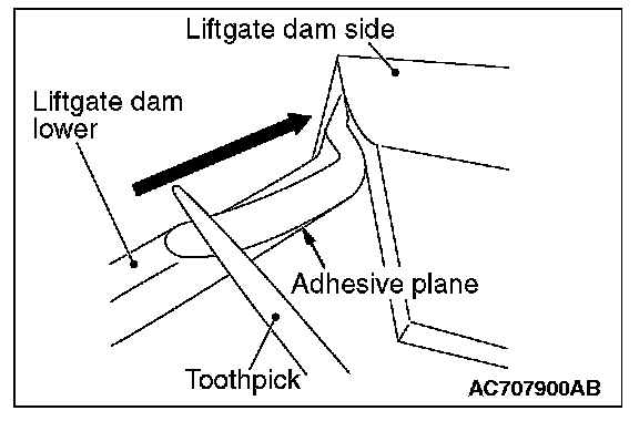NOTE: When applying the adhesive to the adhesion surfaces of the liftgate dam lower and the liftgate dam side (LH, RH), the task becomes easier if a tooth pick is used.
