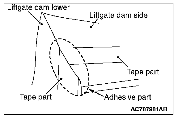 - When adhering the liftgate dam lower center and the liftgate dam lower side, always use the adhesive of specified brand name (otherwise, a blushing occurs to the liftgate dam lower center and the liftgate dam lower side).
