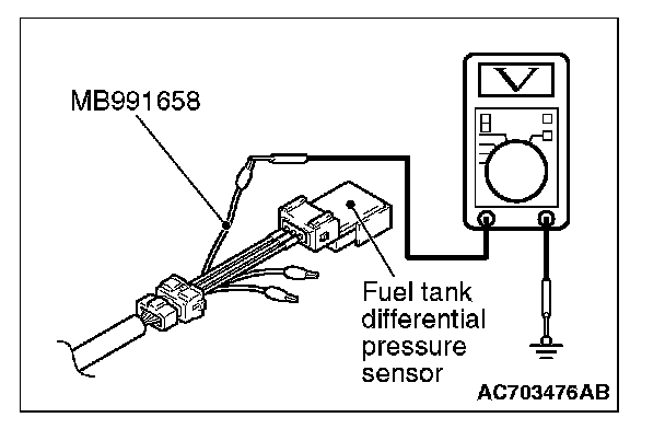 1. Disconnect the fuel tank differential pressure sensor connector and connect special tool MB991658 between the terminals of the disconnected connector.