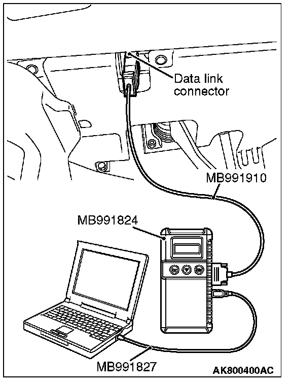 To prevent damage to scan tool MB991958, always turn the ignition switch to the "LOCK" (OFF) position before connecting or disconnecting scan tool MB991958.