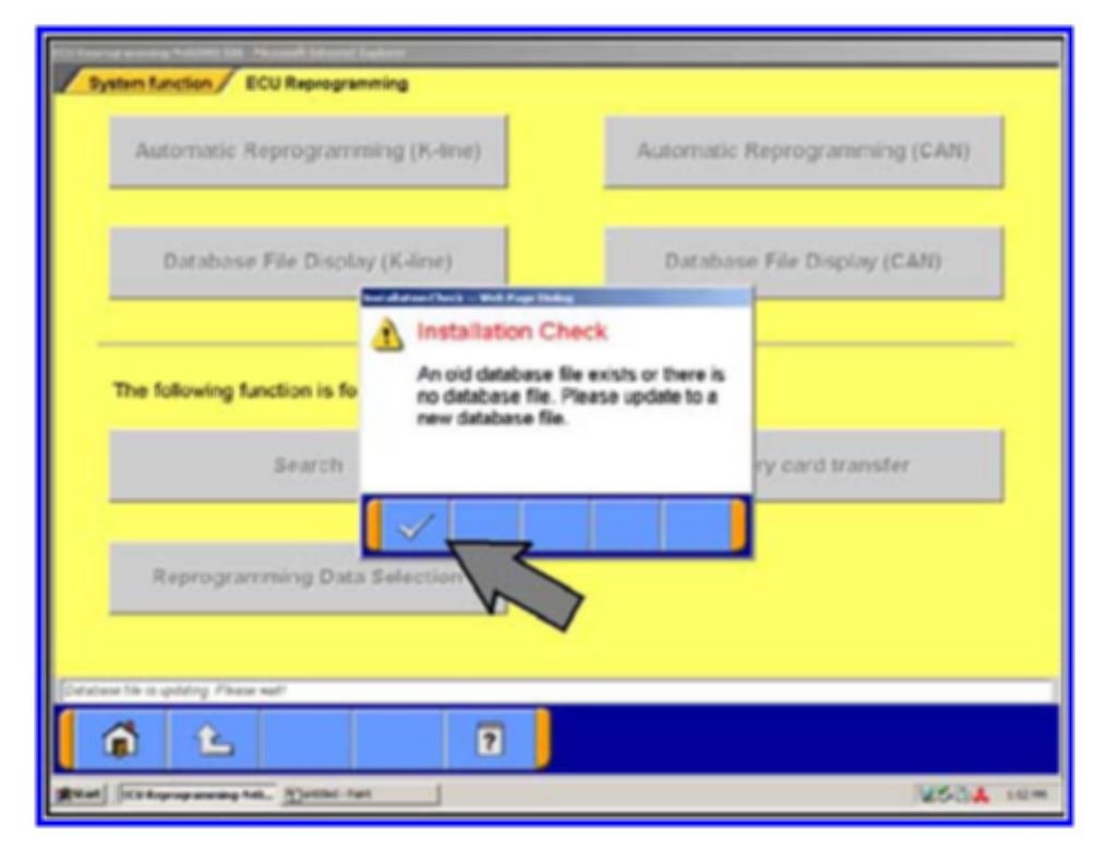 h. A screen will appear advising "Installation Check An old database file exists or there is no database file. Please update to a new database file." Click the check mark in the pop up to continue.