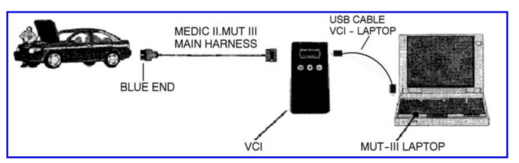 3. Connect the MUT-III main harness with the blue DLC connection to the VCI.