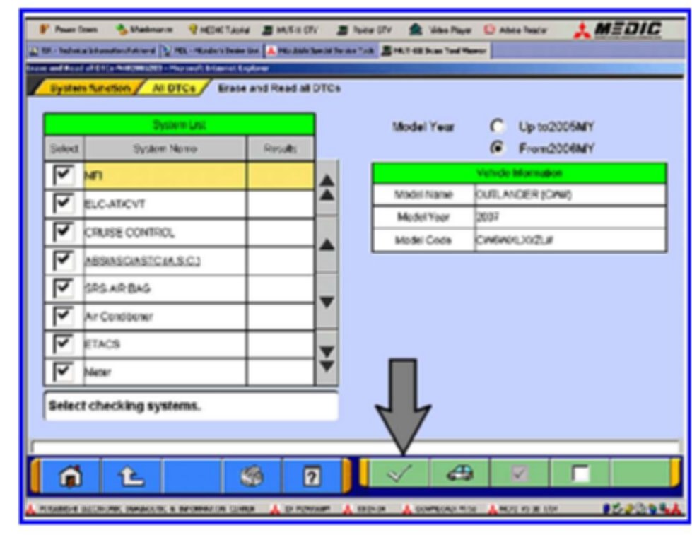 3. Using the MUT III, check and erase ALL DTCs from all systems as follows.