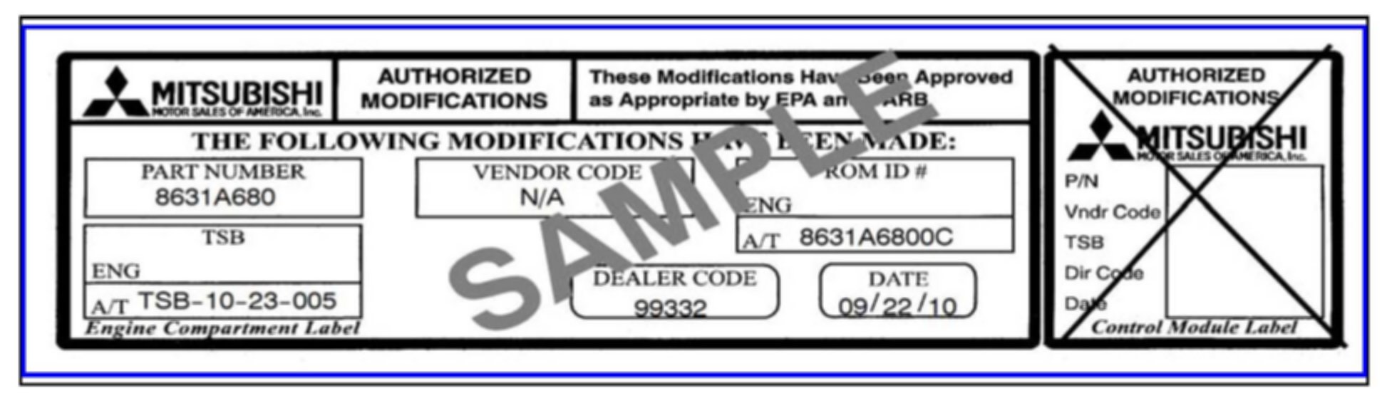 7. Using a ball-point pen enter the appropriate Engine Control Module (ECM) part number Software Part Number (ROM ID#) this Technical Service Bulletin number (TSB-10-23-005), your dealer code and the current date on the Engine Compartment I Control Module Label (p/n MSSF024G00). The Vendor Code is not applicable. The label is available from your facing PDC.