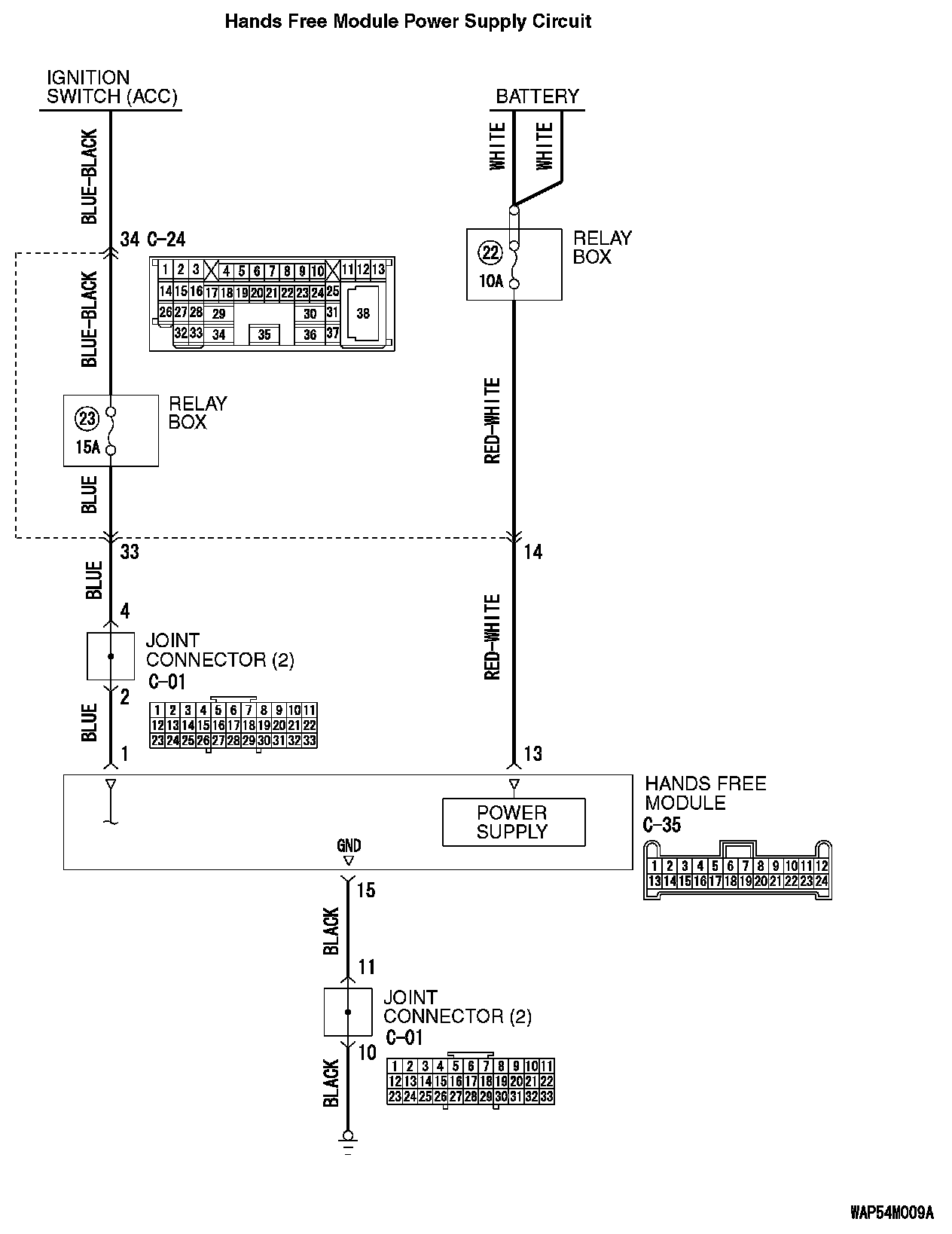 1. Disconnect hands free module connector C-35, and measure the voltage available at the hands free module side of the connector.