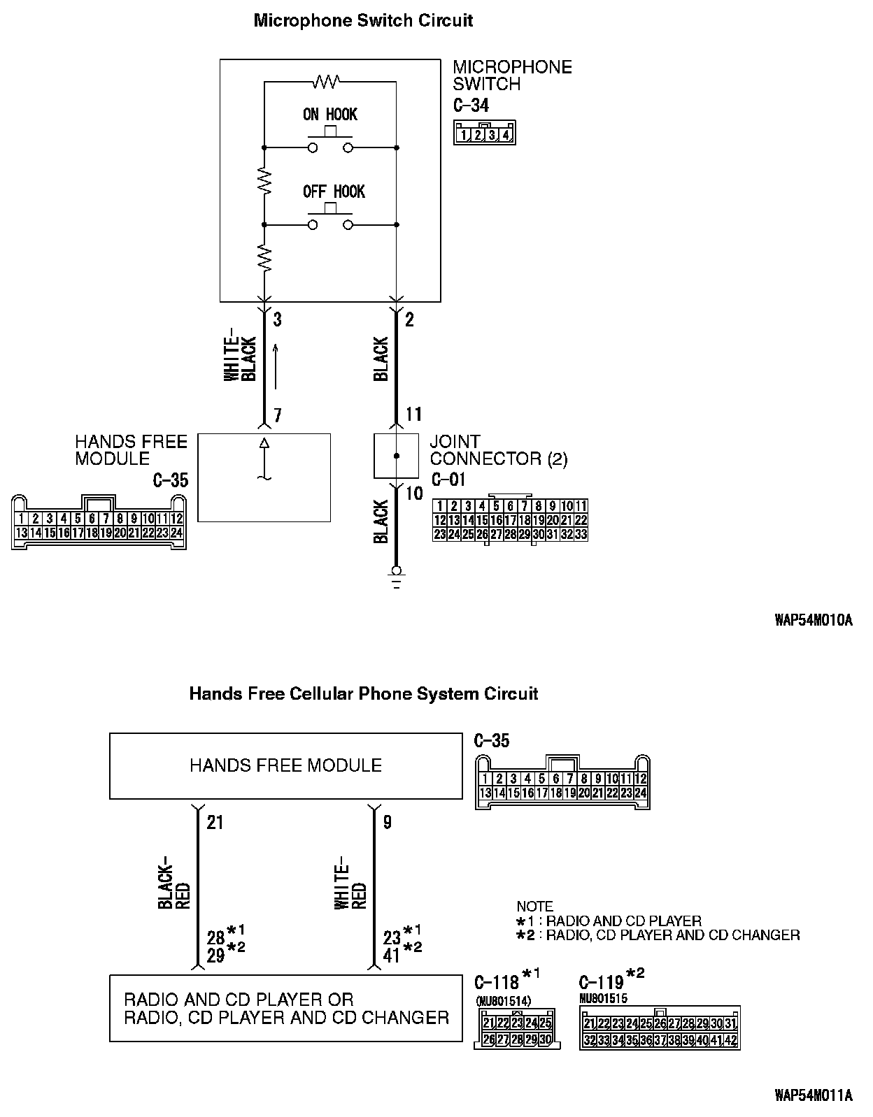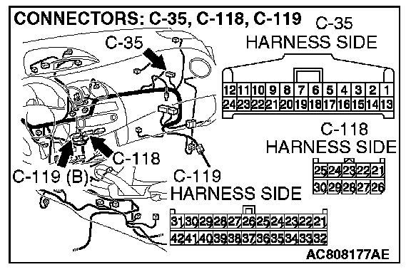 STEP 8. Check the wiring harness between radio and CD player C-118 (terminal 23, 28) or radio, CD player and CD changer C-119 (terminal 41, 29) and hands free module connector C-35 (terminal 9, 21).