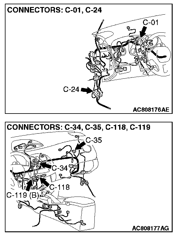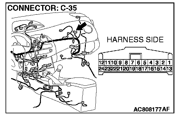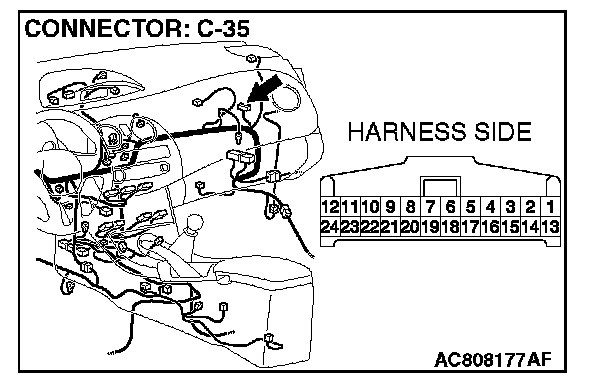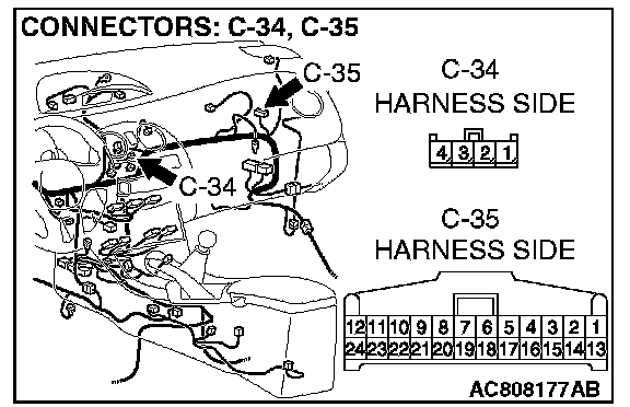 STEP 3. Check hands-free module connector C-35 and microphone switch connector C-34 for loose, corroded or damaged terminals, or terminals pushed back in the connector.