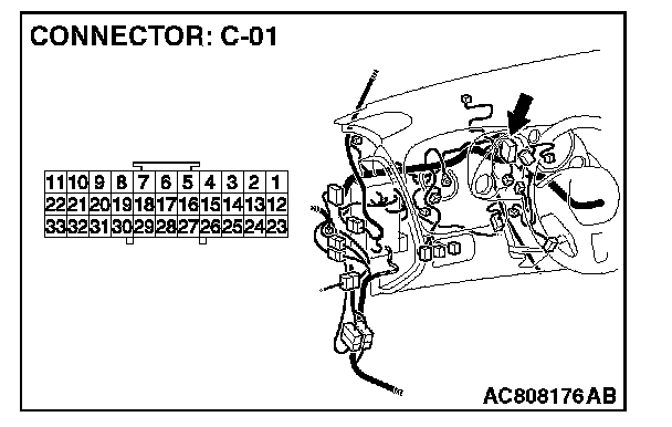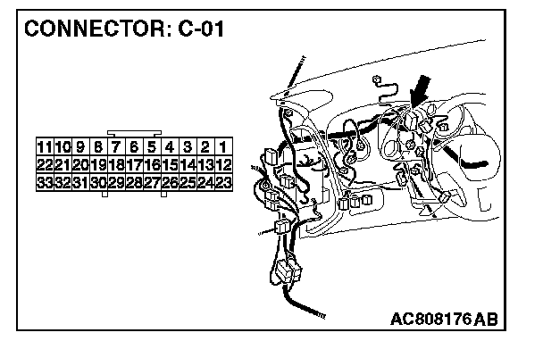 NOTE: Also check joint connector C-01 for loose, corroded, or damaged terminals, or terminals pushed back in the connector. If joint connector C-01 is damaged, repair or replace the connector.