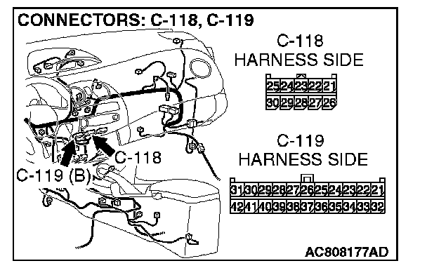 STEP 7. Check radio and CD player C-118 or radio, CD player and CD changer C-119 for loose, corroded or damaged terminals, or terminals pushed back in the connector.