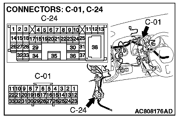 NOTE: Also check intermediate connector C-24 and joint connector C-01 for loose, corroded, or damaged terminals, or terminals pushed back in the connector. If intermediate connector C-24 and joint connector C-01 is damaged, repair or replace the connector.