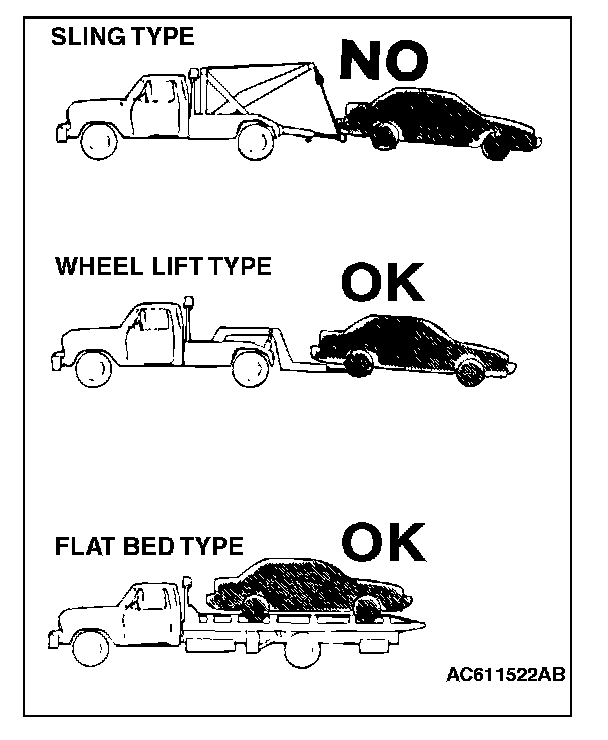 This vehicle cannot be towed by a wrecker using sling-type equipment; otherwise the bumper may become deformed. If this vehicle is towed, use wheel lift or flat bed equipment.