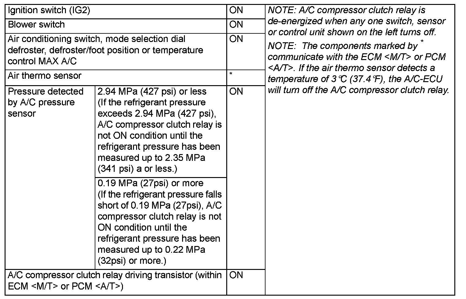 - The dual pressure switch turns OFF when the refrigerant pressure becomes excessively high or low, thus protecting the compressor circuit (See Table below).