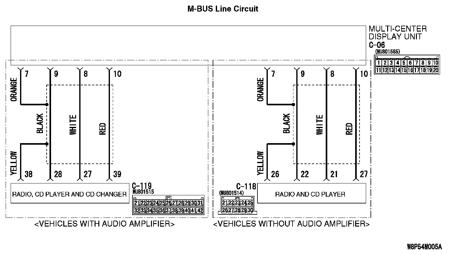 STEP 3. Check the wiring harness between radio and CD player with CD changer connector C-119 (terminal 27, 28, 38 and 39) [Vehicles with audio amplifier] or radio and CD player connector C-118 (terminal 21, 22, 26 and 27) [Vehicles without audio amplifier] and multi-center display unit connector C-06 (terminal 8, 9, 7 and 10).