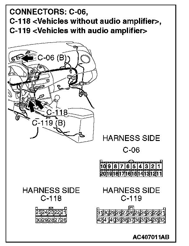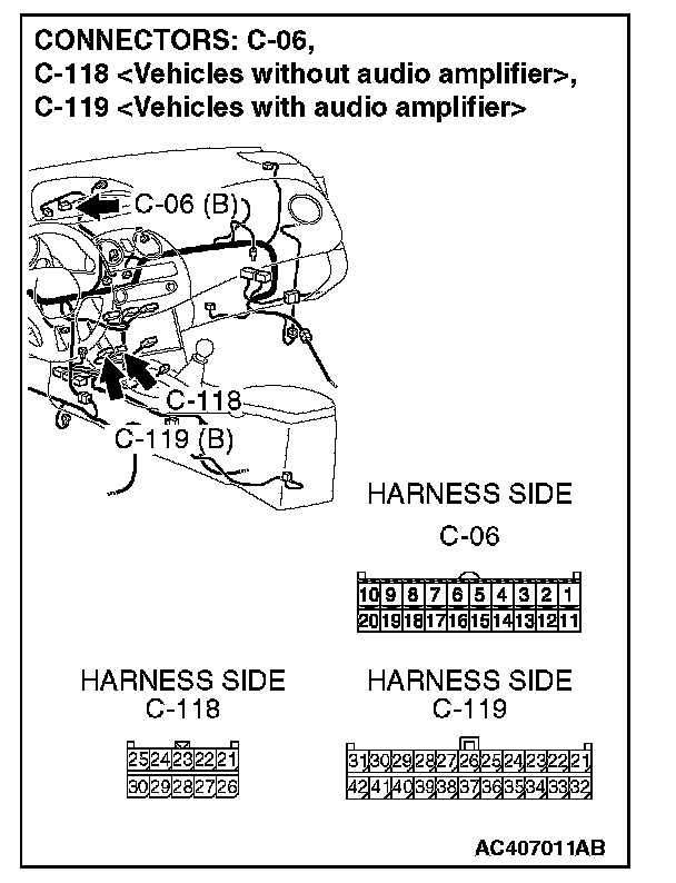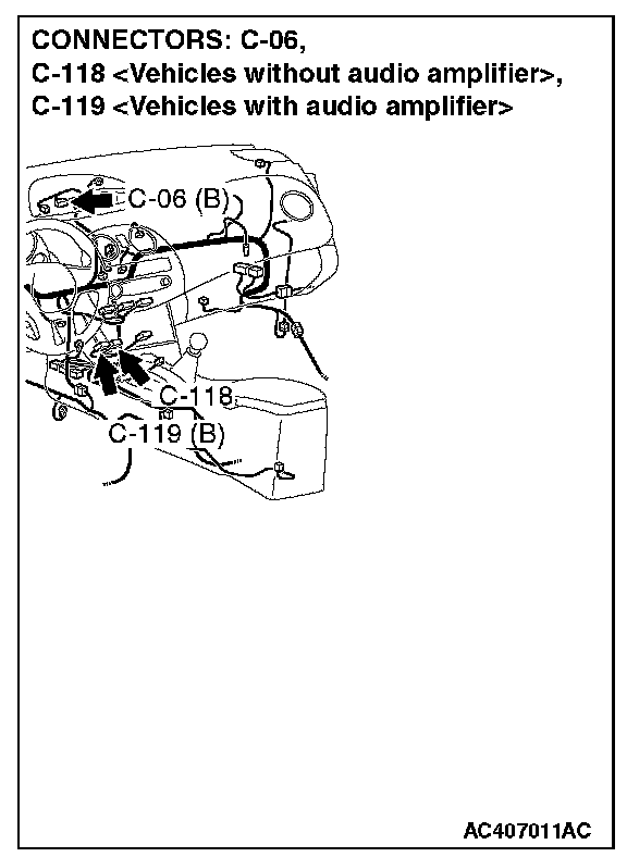 1. Connect the multi-center display unit connector C-06 and radio and CD player with CD changer connector C-119 [Vehicles with audio amplifier] or radio and CD player connector C-118 [Vehicles without audio amplifier].