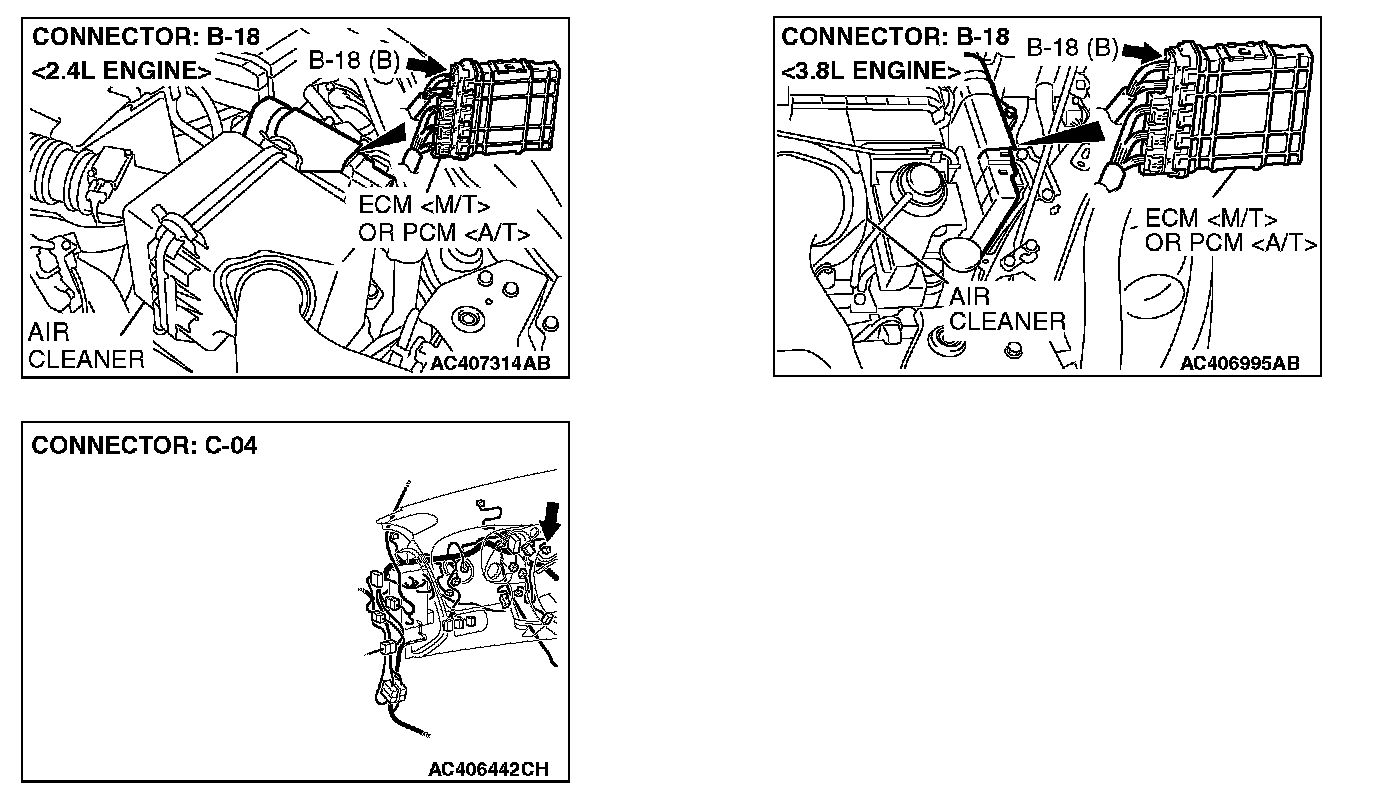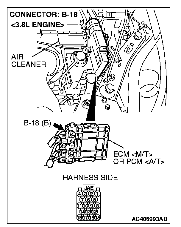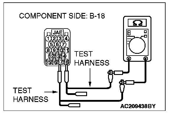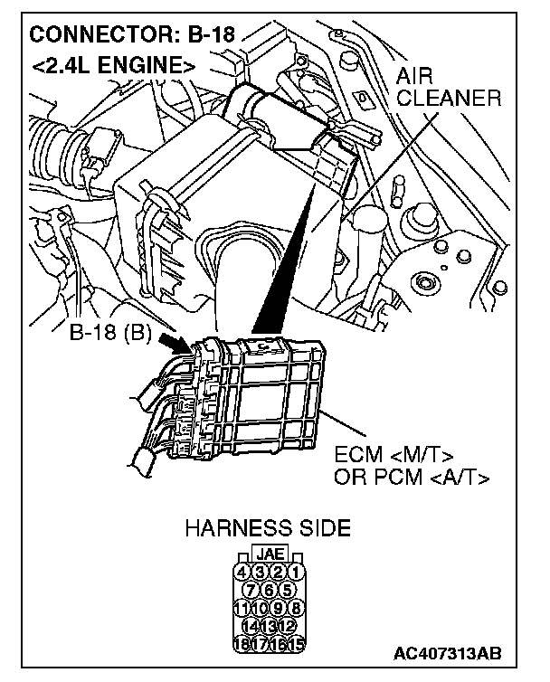 1. Disconnect ECM [M/T] or PCM [A/T] connector B-18, and measure the resistance at the component side of ECM [M/T] or PCM [A/T] connector B-18.