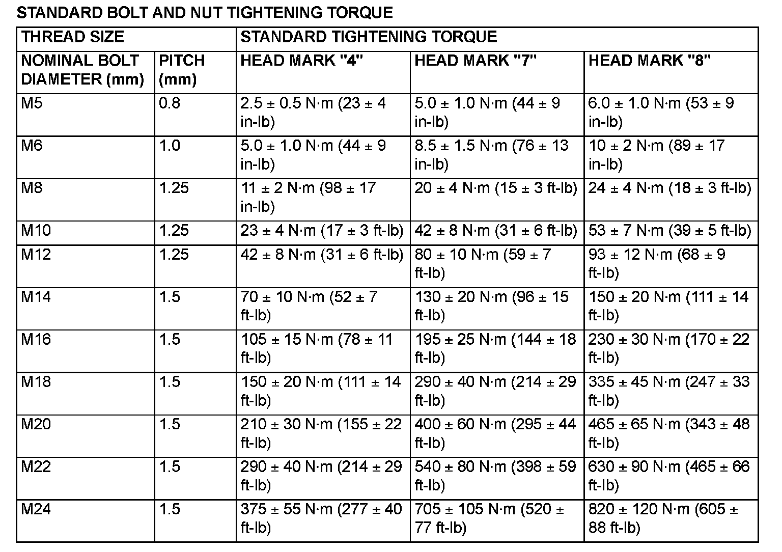 STANDARD BOLT AND NUT TIGHTENING TORQUE
