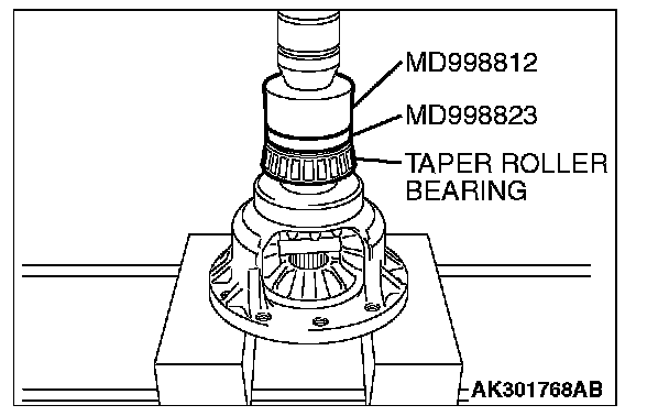 Using special tools MD998812 and MD998823, press in the taper roller bearing.